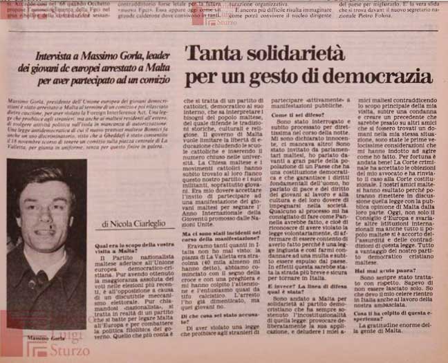 Pur conoscendo la legge imposta nel 1982 dal governo Mintoff – il Foreign Interference Act - che vietava agli stranieri qualsiasi partecipazione ad attività o manifestazioni politiche – decidemmo di recarci a Malta per comprendere meglio la situazione.