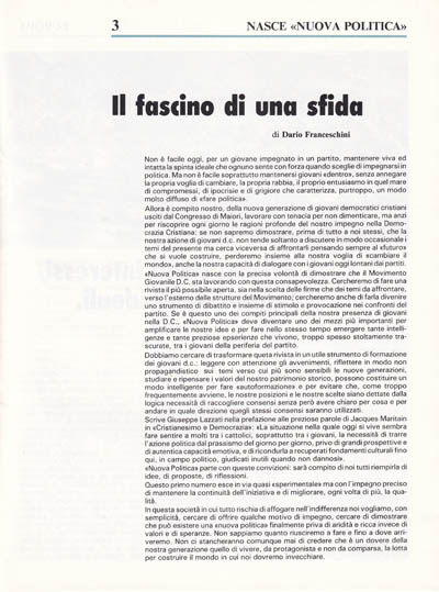 «Nuova Politica» nasce con la precisa volontà di dimostrare che il Movimento Giovanile dc sta lavorando con questa consapevolezza. Cercheremo di fare una rivista il più possibile aperta, sia nella scelta delle firme che dei temi da affrontare, verso l'esterno delle strutture del Movimento; cercheremo anche di farla divenire uno strumento di dibattito e insieme di stimolo e provocazione nei confronti del partito. Se è questo uno dei compiti principali della nostra presenza di giovani nella DC, «Nuova Politica» deve diventare uno dei mezzi più importanti per amplificare le nostre idee e per fare nello stesso tempo emergere tante intelligenze e tante preziose esperienze che vivono, troppo spesso stoltamente trascurate, tra i giovani della periferia del partito.