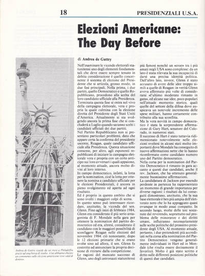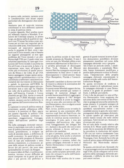 Hart. invece, sembra avere investito le sue speranze in una consistente afTermazione negli Stati del Sud-Ovest, che rappresentano la «nuova America», essendo in continua ascesa economica e tecnologica. Il tutto, però, è reso più complesso dall'incertezza che regna circa l'atteggiamento dei delegati del rev. Jackson e da quelli che non si sono ancora schierati a favore dell'uno e dell'altro dei candidati.