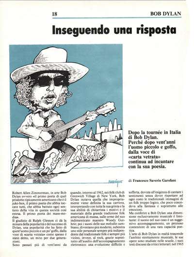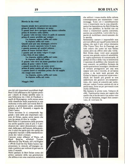 Molti parlano di Bob Dylan come del primo cantante della sua generazione che abbia avuto una coscienza sociale e che utilizzi i mass-media della cultura contemporanea per trasmettere i suoi messaggi. Tutto ciò è indubbiamente vero e importante ma la cosa straordinaria è la rispondenza che Bob Dylan ha fra il suo pubblico, la facilità con cui riesce a trasmettere questa coscienza, questa sua sensibilità, vorrei dire la capacità di mobilitare emotivamente chi lo ascolta.
