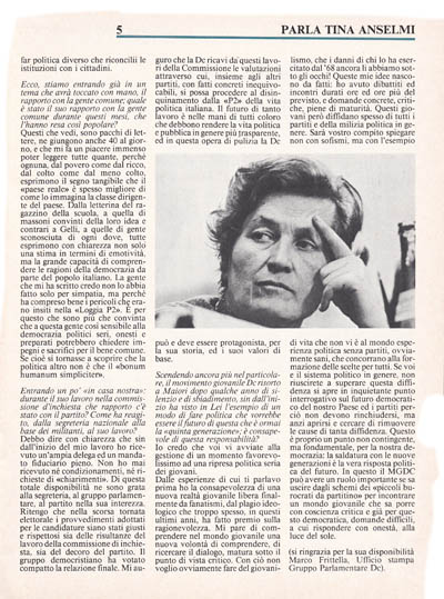Questi che vedi, sono pacchi di lettere, ne giungono anche 40 al giorno, e che mi fa un piacere immenso poter leggere tutte quante, perché ognuna, dal povero come dal ricco dal colto come dal meno colto, esprimono il segno tangibile che il «paese reale» è spesso migliore di come lo immagina la classe dirigente del paese. Dalla letterina del ragazzino della scuola a quella di massoni convinti della loro idea e contrari a Gelli, a quelle di gente sconosciuta di ogni dove, tutte esprimono con chiarezza non solo una stima in termini di emotività, ma la grande capacità di comprendere le ragioni della democrazia da part del popolo italiano. La gente che mi ha critto credo non lo abbia fatto solo per simpatia ma perché ha compreso bene i pericoli che erano insiti nella «Loggia P2». E per questo che sono più che convinta che a questa gente così sensibile alla democrazia politici seri, onesti e preparati potrebbero chiedere impegni e sacrifici per il bene comune. Se cioè si tornasse a scoprire che la politica altro non è che il «bonum humanum simpliciter».