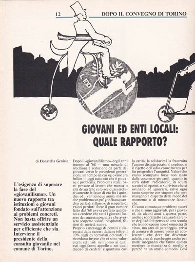 Se al Convegno di Torino, Amministratori, giovani, forze sociali e politiche che dovevano definire competenze e ruoli dell'Ente locale in rapporto alla realtà giovanile non sono giunti sempre a risultati concreti è anche per le difficoltà che crea il permanere in concezionitroppo schematiche, proprio nelle amministrazioni di sinistra che sono poi quelle che più han creato strumenti appositi per occuparsi del mondo giovanile.