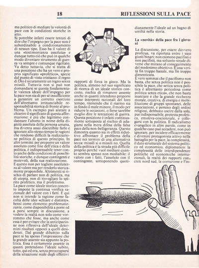 C'è una nuova consapevolezza politico-culturale nelle nuove generazioni di oggi: il diritto di vivere, il diritto ad una vita dignitosa e libera dall'incubo nucleare. Questa nuova consapevolezza porta con sè una ambiguità: se la voglia di vivere si riduce ad una piatta sopravvivenza si finisce nel vicolo cieco del «meglio rossiche morti». Ma se la voglia di vivere è ricerca di una vita piena di senso è tentativo di realizzarsi come persona e voler cambiare il mondo attorno a noi allora questa nuova coscienza diviene un piccolo segno di speranza fra le macerie di un mondo che muore. Il movimento per la pace cerca di dare voce ad una rivolta etica ad un bisogno di futuro in un mondo ridotto a presente. Un movimento che fatica a liberarsi dalle pastoie ideologiche, dalle ingerenze di partito che sempre rischiano di ingabbiarlo, di renderlo innocuo ed evanescente. Gesti, linguaggi, comportamenti di pace sono difficili da esprimere perché siamo intrisi di una cultura politica che ha mutuato concetti, parole, comportamenti dal contesto militare.
