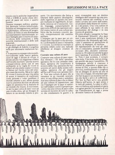 Costruire una cultura di pace significa ritessere i fili della speranza: speranza che le cose possano cambiare, speranza che scopriremo il mistero della vita, speranza che riusciremo ad uscire dalla nostra solitudine, speranza che gli imperi all'Est e all'Ovest non saranno eterni. Non una cultura di pace che si esaurisce in un viscerale neutralismo, in una difesa pura e semplice; non una cultura di pace che si riduce ad una cultura di opposizione, per cui l'impegno per la pace si esaurisce nell'andare contro il proprio governo; ma una cultura di pace come terreno di incontro di tutte le culture che condannano le guerre e le armi ritenendole non un destino obbligato dell'umanità ma una proiezione esterna del conflitto le cui radici covano nel cuore dell'uomo, un prodotto delle brame di ricchezze e del potere. Una vera cultura di pace affonda le sue radici in una promozione del dialogo e in una ricerca di giustizia.