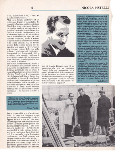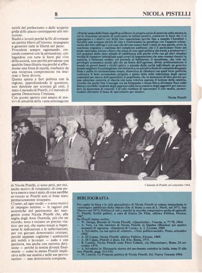 È un segno particolarmente importante e significativo che i nuovi giovani della Democrazia Cristiana intendano oggi rileggere. con «Nuova Politica», la breve ma splendida battaglia di Nicola Pistelli. esponente di quella leva giovanile che, all'indomani della caduta del fascismo, era desiderosa di partecipare alla evoluzione politica nazionale portando un proprio contributo di idee al partito nuovo dei cattolici democratici.