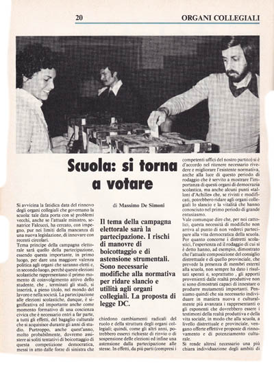 Tema principe della campagna elettorale sarà quello della partecipazione, essendo questa importante, in primo luogo. per dare una maggiore valenza politica agli organi che saranno eletti e, in secondo luogo, perché queste elezioni scolastiche rappresentano il primo momento di coinvolgimento attivo dello studente, che, terminati gli studi, si inserirà, a pieno titolo, nel mondo del lavoro e nella società. La partecipazione alle elezioni scolastiche, dunque, è significativa ed importante anche come momento formativo di una coscienza civica che è necessario entri a far parte, a tutti gli effetti, del bagaglio culturale che si acquisisce durante gli anni di studio. Purtroppo, anche quest'anno, molto probabilmente, dovremo assistere ai soliti tentativi di boicottaggio di questa competizione democratica, messi in atto dalle forze di sinistra che chiedono cambiamenti radicali del ruolo e della struttura degli organi collegiali; quindi, come gli altri anni, potrebbero esserci richieste di rinvio o di sospensione delle elezioni ed infine una astensione dalla partecipazione alle stesse. In effetti, da più parti (compresi i competenti uffici del nostro partito) si è d'accordo nel ritenere necessario rivedere e migliorare l'esistente normativa, anche alla luce di questo periodo di rodaggio che è servito a mostrare l'importanza di questi organi di democrazia scolastica, ma anche alcuni punti «talloni d'Achille» che, se rivisti e modificati, potrebbero ridare agli organi collegiali lo slancio e la vitalità che hanno conosciuto nel primo periodo di grande entusiasmo.