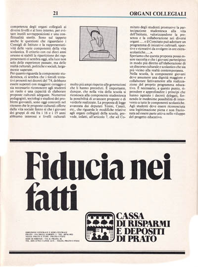 Speriamo che questa proposta possa essere raccolta e che i giovani partecipino in modo più diretto all'elaborazione di un discorso culturale e scolastico che sia più vicino alla realtà contemporanea. Nella scuola, la componente giovani deve assumere una dignità maggiore e collaborare fattivamente alla realizzazione del proprio programma educativo. È necessario, a questo punto, riprendere e approfondire i principi che hanno ispirato i decreti delegati, fornendo le medesime possibilità di intervento a tutte le componenti scolastiche. Agli studenti deve essere riconosciuta una legittimazione piena e non frazionata ad essere parte attiva nello sviluppo del progetto educativo.