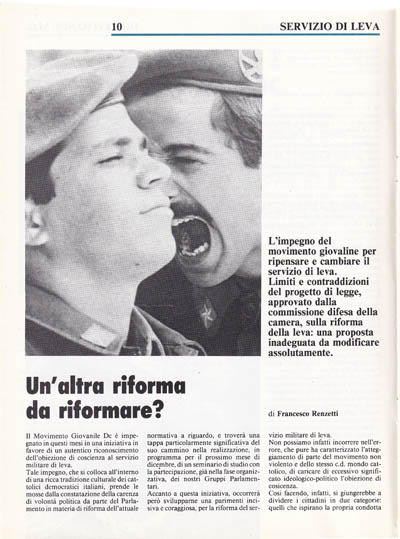 Di tale nuova prospettiva, che potrebbe positivamente rispondere ai problemi di motivazione a cui sopra accennavo ed a favore della quale i giovani dc si sono fermamente pronunciati, non c'è traccia nella proposta di legge di riforma del servizio di leva, che si presenta, piuttosto, informata da uno spirito di rassegnazione, tendente alla conservazione dell'esistente, ispirato più alla falsa saggezza popolare del «chi lascia la strada vecchia per la nuova...», che alla carica riformatrice propria della nostra tradizione politica.