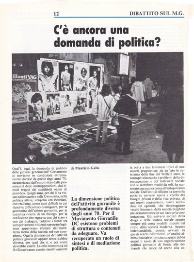 A parte le considerazioni sulla struttura del MG, che pure da un lato appaiono discrimanti e dall'altro aprono la strada a imprevedibili conseguenze non prive di rischi, come la professionalità dell'attività politica nelle strutture di vertice, mi pare opportuno concentrare l'attuazione nuovamente ai temi iniziali. Le nuove solitudini ed i nuovi egoismi: è importante comprendere che i linguaggi richiesti sono opposti: per rispondere ai bisogni dei drogati e degli emarginati, per cercare risposte di tipo politico a queste storture della società occorre riacquisire valori del cristianesimo e della solidarietà cristiana. Così pure per l'antagonismo sociale è fuor di dubbio che solo dall'accettazione coerente ed incondizionata di stili di vita più legati al rigore morale e al rifiuto di modelli imitativi e consumistici è possibile recuperare un punto di visione oggettivo al centro. Perciò occorre coniugare solidarietà e rigore morale in modo coerente, fino ai comportamenti personali. fino e oltre il particolare individuale. con uno spirito di servizio senza condizioni, se di certezze, in un mondo dominato dal paradigma relativistico, è impossibile dialogare con i non cattolici, occorre fare in modo, come dice il P. Sorge, da professare le certezze che sorgono dal nostro animo e dalla fede, con la vita quotidiana. La rigorosità morale è un esempio che nasce dalle persone, non dai partiti e neanche alla realtà pluralistica statale e sociale, che in ciò non ha retaggio storico né dignità morale. Rispetto al problema della frantumazione e della corporativizzazione dei conflitti politici occorre ricordare che il ruolo di un partito come la DC è e rimane quello di sintesi delle proposte e delle esigenze della base che, raccolte attraverso il canale istituzionale del partito trovano sbocco nella costruzione del cosiddetto progetto cattolicodemocratico. Questo è ciò che il partito non è stato negli ultimi anni, e che ha fallito dopo gli anni del rinnovamento di Zaccagnini. Il MG ha vissuto di riflesso questa crisi del ruolo istituzionale del partito.