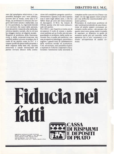 Chi ci impone questi modelli così lontani dal Movimento o dal partito che noi conosciamo, fondato sul volontariato di molti e sul consenso talvolta sporadico all'attività sociale? Credo che sia la realtà sociale e culturale che lo impone, quasi come un linguaggio impostaci per avvicinarci a fascie di consenso da molto tempo definitivamente allontanate dal nostro MG e dalla Democrazia Cristiana.