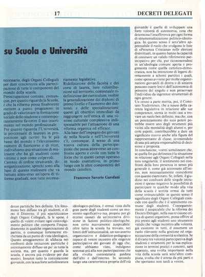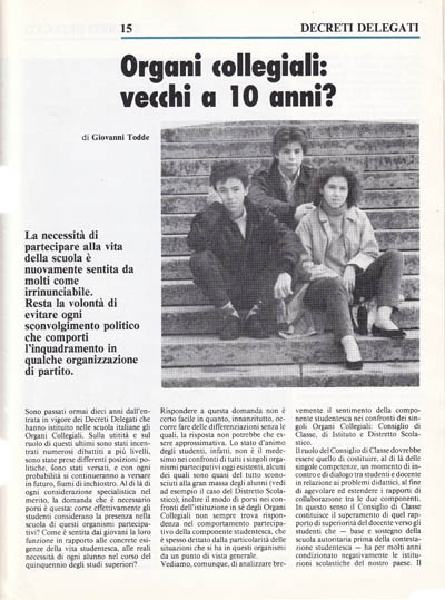 Sono passati ormai dieci anni dall'entrata in vigore dei Decreti Delegati che hanno istituito nella scuola italiane gli Organi Collegiali. Sulla utilità e sul ruolo di questi ultimi sono stati incentrati numerosi dibattiti a più livelli, sono state prese differenti posizioni politiche, sono stati versati, e con ogni probabilità si continueranno a versare in futuro, fiumi di inchiostro. Al di là di ogni considerazione specialistica nel merito, la domanda che è necessario porsi è questa: come effettivamente gli studenti considerano la presenza nella scuola di questi organismi partecipativi? Come è sentita dai giovani la loro funzione in rapporto alle concrete esigenze della vita studentesca, alle reali necessità di ogni alunno nel corso del quinquennio degli studi superiori?