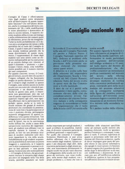 Per quanto concerne, invece, il Consiglio di Istituto occorre dire che questo è l'organo collegiale che ha funzionato meglio in questo decennio. Le elezioni per il ronnovo degli studenti in questo Consiglio, sono sentite ancora in molte scuole con una notevole volontà di partecipazione e un discreto interesse. Anche in questo caso, però, è importante non generalizzare: dire che nel caso di questo organismo l'attenzione è superiore rispetto agli altri, non significa affermare che la partecipazione sia globale: spesso, anche se in tutte le scuole esistono dei gruppi di studenti promotori che coordinano la presentazione di varie liste e la partecipazione al voto è piuttosto elevata, permangono numerosi atteggiamenti di apatica indifferenza verso questa istituzione. Tali atteggiamenti sono determinati da una serie di fattori, tra cui la convinzione molto diffusa che, anche a causa della sproporzione numerica dei rappresentanti. gli studenti non abbiano voce in capitolo durante le riunioni e che, quindi. la loro sia una presenza incapace di incidere realmente sulle decisioni riguardanti la vita della scuola. Indubbiamente se gli studenti acquisissero la possibilità di esercitare un potere maggiore e, soprattutto, se il rapporto con le altre componenti si potesse svolgere su basi paritarie – cosa questa spesso riconosciuta solo nominalmente – il Consiglio di Istituto, che già attualmente riscuote la simpatia degli alunni più attivi ed impegnati nella vita della scuola, potrebbe assumere un ruolo