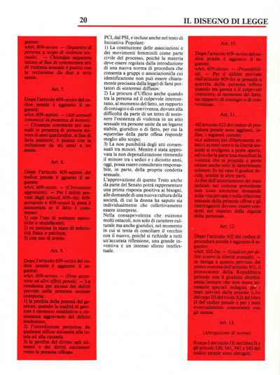 - La violenza sessuale riconosciuta come reato contro la persona, (per la prima volta, con l'approvazione di tutti igruppi parlamentari, la libertà sessuale entra a pieno titolo nel codice penale come una delle libertà personali);