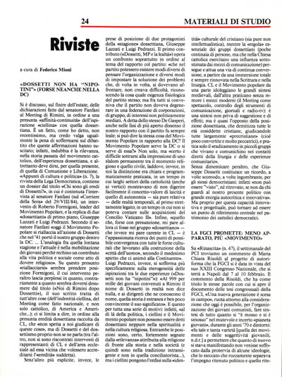 «Appunti di cultura e politica» (n. 7), la rivista della Lega Democratica, contiene un dossier dal titolo «Chi sono gli eredi di Dossetti?», in cui è contenuta l'intervista al senatore Fanfani (sul «Corriere della Sera» del 29NIIV84), un intervento di Roberto Formigoni, leader del Movimento Popolare, e la replica di due «dossettiani» di primo piano, Giuseppe Lazzati e Luigi Pedrazzi. Secondo il senatore Fanfani «oggi il Movimento Popolare si riallaccia all'azione di Dossetti che nel '41 portò il nostro gruppo dentro la DC. L'analogia fra quella lontana stagione e l'attuale è nella mobilitazione dei giovani perché rechino un contributo alla vita politica e sociale come atto di dovere religioso». Su questo presunto «riallacciarsi» sembra prendere posizione Formigoni, il cui intervento peraltro lascia perplessi in quanto, contrariamente a quanto sembra doversi desumere dal titolo («Noi di Rimini dopo Dossetti»), il suo scritto tratta di tutt'altre cose (dell'indentità ciellina, del Meeting come fatto nazionale, e non solo cattolico, di America e Americhe ); ci si limita a dire, in ordine alla presunta eredità dossettiana raccolta da CL, che «non spetta a noi giudicare di queste cose», ma di Dossetti e del dossettismo proprio non se ne parla (tra l'altro, non si sono riscontrati interventi di rappresentanti di CL e dell'area ecclesiale ad essa vicina che volessero accreditarsi l'«eredità» suddetta).