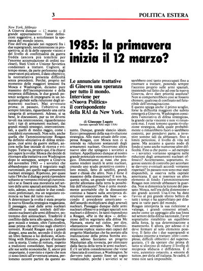 Fine dell'era glaciale nei rapporti fra i due supergrandi; neo-distensione in prospettiva; al di là delle opposte visioni e del livello di conflittualità da guerra fredda (ancora più temibile per l'enorme accumulazione di ordini nucleari), Stati Uniti e Unione Sovietica condannati a trattare. Cogliere, al tempo stesso, da parte perlomeno degli osservatori più attenti, il dato obiettivo; la neo-trattativa presenta difficoltà senza precedenti. Perché, proprio nel momento delle maggiori tensioni fra Mosca e Washington, diciamo pure massimo dell'incomprensione e della reciproca diffidenza, le due grandi potenze scelgono di impegnarsi in un negoziato globale sulla riduzione degli armamenti nucleari. Mai avvenuto prima; in passato, l'obiettivo era sempre limitato, riguardando una certa categoria di armamenti. Adesso, si sa bene, le discussioni, pur su tre diversi tavoli ma interconnessi, riguarderanno tutti i tipi di armamenti nucleari, dai grandi missili strategici, intercontinentali, a quelli di medio raggio, come i cosiddetti euromissili. Non solo, anche quella che l'amministrazione Reagan ha definito «Iniziativa di difesa strategica», cioè armi da guerre stellari, ancora nella fase iniziale di ricerca e sviluppo. Tuttavia, proprio qui, è la chiave per capire la svolta: Mosca che decide di ritornare alla trattativa con Washington dopo lo «strappo», sempre a Ginevra del novembre 1983 - i sovietici che abbandonano prima il negoziato sugli euromissili, poi quello sugli armamenti nucleari strategici. Ripetono, per quasi tutto1'84 che il dialogo potrà riprendere soltanto se verranno ritirati gli euromissili e se si fisserà una moratoria nel settore delle armi spaziali antimissile. Non solo, adesso, sono cadute le due condizioni preliminari, ma un negoziato comincia su basi del tutto nuove.
