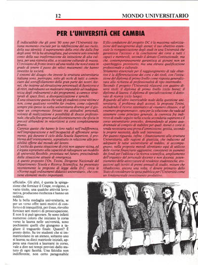 È indiscutibile che gli anni '80 sono per l'Università italiana momento cruciale per la ridefinizione del suo ruolo, della sua identità: il superamento della crisi che dalla fine degli anni '60 la ha attanagliata, può avvenire solo tenendo conto della sua trasformazione da istituzione di alta cultura, per una ristretta elite, a occasione culturale di massa. Ci troviamo di fronte invece ad una realtà che non è stata in grado di tenere il passo dei veloci mutamenti che hanno investito la società.
