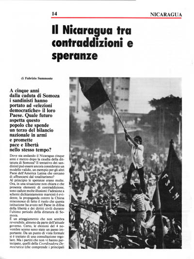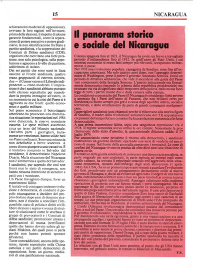 Il tentativo di coniugare insieme rivoluzione e democrazia, di condurre il popolo nicaraguense a decidere del proprio destino dopo anni di dominio straniero, non è riuscito a conciliare l'impossibile: stato di polizia e diritti civili; libere elezioni e sopravvivenza di strutture rivoluzionarie come le «lurbas» (i gruppi di provocatori) e i Comitati di difesa sandinisti; promozione umana e deportazioni di massa (terrificanti quelle che hanno dovuto subire gli indiani Miskitos, dei quali poco si parla perché non hanno potenti sponsor all'estero).