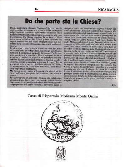 Da che parte sta la Chiesa in Nicaragua? Sta con i sandinisti, come farebbe supporre la presenza di ben tre religiosi nel governo, o li combatte? Il problema è complesso e non basta rispondervi schematicamente accennando alla contrapposizione fra Chiesa popolare da un lato e Chiesa istituzionale dall'altro. Fra l'altro questo dualismo ha ragion d'essere solo nei libelli propagandistici, dal momento che pone sullo stesso piano due realtà totalmente diverse.