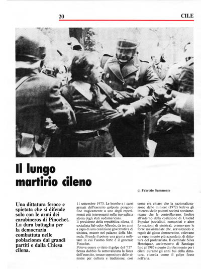 Il presidente della repubblica cilena. il socialista Salvador Allcnde, da tre anni a capo di una coalizione governativa di sinistra, muore nel palazzo della Moneda. Prende il potere una giunta militare in cui l'uomo forte è il generale Pinochet.