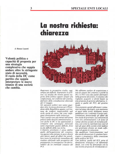 La chiave di lettura di questo appuntamento elettorale non può e non deve guardare solo al dato complessivo nazionale. Non contano le variazioni in percentuale in aumento o in diminuzione dei consensi calcolati sull'intero territorio nazionale; ciò che conta è creare una base di consenso su una proposta di governo della città che permetta alla DC, da una parte, di consolidare le sue posizioni e dall'altra di puntare ad una credibile alternativa di governo rispetto alle «mitiche» giunte rosse che hanno esaurito ormai, nel peggiore dei modi, il loro fascino che sapeva troppo di effimero.
