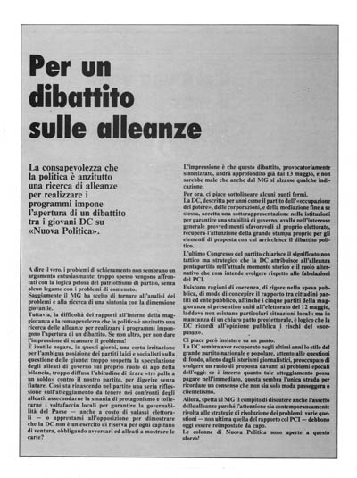 Esistono ragioni di coerenza, di rigore nella spesa pubblica, di modo di concepire il rapporto tra cittadini partiti ed ente pubblico, affinché i cinque partiti della maggioranza si presentino uniti all'elettorato del 12 maggio, laddove non esistano particolari situazioni locali: ma in mancanza di un chiaro patto preelettorale, è logico che la DC ricordi all'opinione pubblica i rischi del «sorpasso».