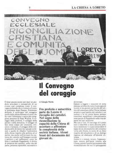 È forse ancora presto per dare un giudizio articolato e consapevole di un evento così complesso come il convegno ecclesiale che si è tenuto a Loreto la settimana dopo Pasqua. Potremmo definirlo il «convegno del coraggio» quello della chiesa Italiana a Loreto che ha visto l'altrettanto e ancor più coraggiosa presenza di Papa Wojtyla. Il coraggio della profezia, il coraggio della parola e della denuncia, il coraggio di fare «mea culpa» per omissioni, reticenze e latitanze, il coraggio della condanna delle divisioni tra i gruppi ecclesiali e quello di ribadire l'autonomia della chiesa rispetto alla politica ed ai partiti, ma anche nell'invocare la coerenza dei cattolici nell'impegno sociale e politico e nel riaffermare, come ha fatto il cardinale Pappalardo. il diritto di presenza dei cattolici, nella vita del paese, presenza «possibile, necessaria e doverosa».