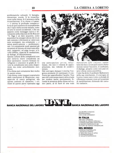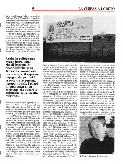 l'intera articolazione del fenomeno e di prevederne magari gli sviluppi. È questo un grande contributo che la chiesa italiana ha dato a Loreto superando l'istanza un po' culturalistica di offrire analisi su analisi, ma creando dimensioni di ascolto e di ispirazione, dando vita ad un clima di vivacità spirituale in cui le decisioni e gli orientamenti dei pubblici poteri trovino un supporto ideale e una concretezza morale che li renda credibili ed efficaci.