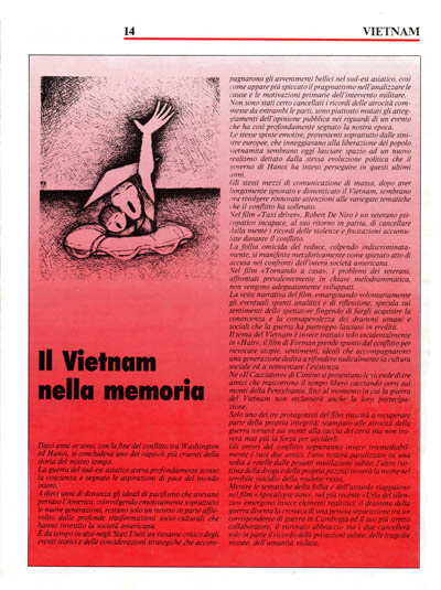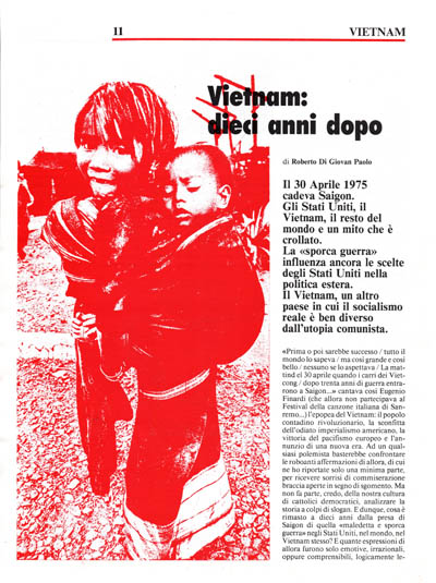 «Prima o poi sarebbe successo / tutto il mondo lo sapeva / ma così grande e così bello / nessuno se lo aspettava / La mattina del 30 aprile quando i carri dei Vietcong / dopo trenta anni di guerra entrarono a Saigon...» cantava così Eugenio Finardi (che allora non partecipava al Festival della canzone italiana di Sanremo...) l'epopea del Vietnam: il popolo contadino rivoluzionario, la sconfitta dell'odiato imperialismo americano, la vittoria del pacifismo europeo e l'annunno di una nuova era. Ad un qualsiasi polemista basterebbe confrontare le roboanti affermazioni di allora, di cui ne ho riportate solo una minima parte, per ricevere sorrisi di commiserazione braccia aperte in segno di sgomento. Ma non fa parte, credo, della nostra cultura di callolici democratici. analizzare la stona a colpi di slogan. E dunque. cosa è rimasto a dicci anni dalla presa di Saigon di quella «malcdclla e sporca guerra» negli Stati Uniti, nel mondo, nel Vietnam stesso? E quante espressioni di allora furono solo emotive, irrazionali, oppure comprensibili, logicamente·legate ai tempi? Coloro che maggiormente vivono questi dubbi oggi, non vi è dubbio, sono i cittadini statunitensi. E non solo perché ricorrono dieci anni da quella fatidica data, ma perché da qualche anno si vive un generale clima di riflessione critica su tutti i vari atteggiamenti passati sul caso-Vietnam. Non starò qui ad analizzare ogni singola visione espressa dal mondo della cultura o della politica, o anche dal cittadino medio degli Stati Uniti, ma è innegabile che il «Memoriale» fatto costruire dal Presidente Ronald Reagan a Washington, su cui, nella lucida facciata si allineano i nomi di 58.022 caduti statunitensi compresi tra il soldato scelto Jàmes Davis (22 dicembre 1961) e il caporale Darwin Judge caduto il 29 aprile 1975, ha riaperto una ferita tuttora viva nella vita del popolo nordamericano. Dopo gli anni del silenzio e della vergogna, films come «Tracks, lunghi binari della follia», o «Tornando a casa» o i più conosciuti dal grande pubblico «Il Cacciatore» e «Apocalypse Now» avevano già spettacolarmente riproposto spunti per un dibattito meno fazioso, meno ideologico, forse, di quello degli anni precedenti.