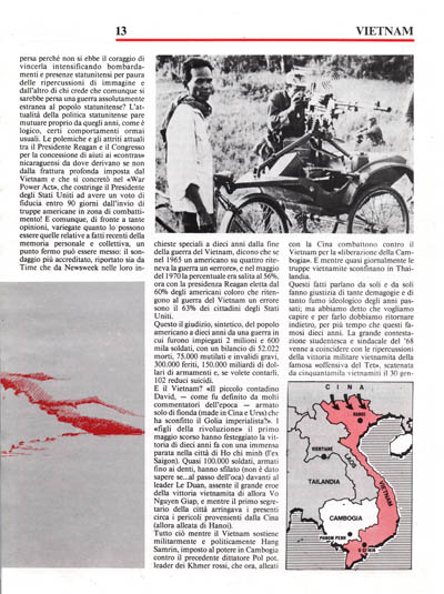 Eppure, dicevamo, «quel grande movimento internazionalista» si cominciò a sfaldare proprio allora. Per questa nuova diversa rilevanza ideologica i rapporti tra Urss e Cona si raffreddarono, il sud del Vietnam non insorgeva in aiuto del nord come qualsiasi apprendista illuminisa-rivoluzionario di allora si sarebbe aspettato viste le grandi premesse; e i grandi movimenti di sinistra occidentali si dispersero in partiti e partitini a seconda del loro pensiero sul metodo con cui fare la rivoluzione, per cui alcuni rientrarono nei canoni del socialismo democratico, altri decisero che era giunto il momento di fare le avanguardie armate della lotta operaia anche in occidente (Raf, Br...). E dopo la vittoria? La crescita di un paese totalitario, militarista, imperialista (secondo le stesse categorie marxiste), nei confronti dei «paesi fratelli», Cambogia, Laos, Thailandia, e fortemente dipendente da un'altra superpotenza quale la Russia. Un paese che ancora una volta dimostra l'impossibilità dell'esistenza di un socialismo dal volto umano; in cui anzi si contraddicono i principi basilari della democrazia socialista. Che uguaglianza può esserci in un paese che pur di mantenersi forte affama il proprio popolo, lo lascia analfabeta, lo rende dipendente da una superpotenza?