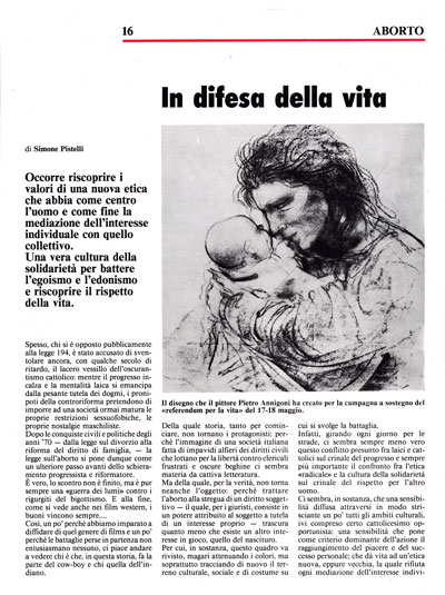 Ci sembra poi che l'abortismo libertario costituisca l'esito coerente, anche se non estremo, di questa antropologia: che cioè parlare dell'aborto come di un diritto civile, in base al noto aforisma «l'utero è mio e lo gestisco io» sia il frutto omicida dell'individualismo edonista e possessivo, il quale a tal punto dimentica e comprime l'interesse altrui da parlare di autodeterminazione della donna e di esercizio della libertà, anche quando è in gioco la determinazione violenta e unilaterale. quindi autoritaria, del destino altrui; che l'unica colpa del nascituro sia di non avere abbastanza forza contrattuale per imporre ad alta voce il proprio interesse a vivere, in un paese che si commuove in difetta quando la morte casuale e drammatica di un bambino in fondo a un pozzo fa spettacolo, ma che protesta infastidito quando un giornalista coraggioso come Biagi trasmette le immagini agghiaccianti di un feto che si difende dalla «aspirazione», mettendo così in discussione le proprie certezze.