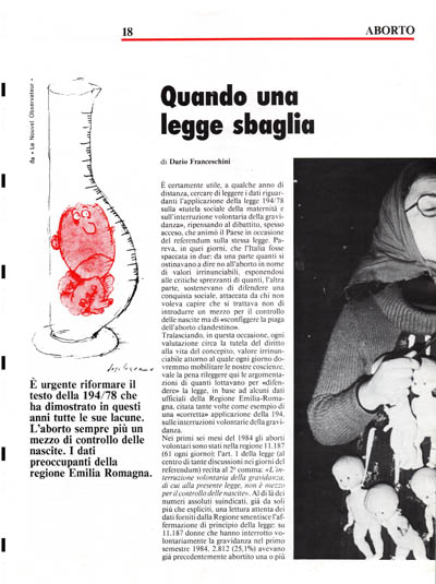 La sensazione, purtroppo, è che esista una responsabilità di tutti nell'aver abbandonato ogni possibile forma di intervento migliorativo nella fase di applicazione della legge 194, come se il voto popolare sul referendum avesse ottenuto il risultato (... c'era, in verità, chi aveva previsto una conseguenza inevitabile di questo tipo in caso di mancata abrogazione) di dare via libera all'aborto totalmente liberalizzato. Esiste oggi lo spazio, viceversa, per una battaglia quotidiana per limitare il più possibile i danni dell'attuale normativa.