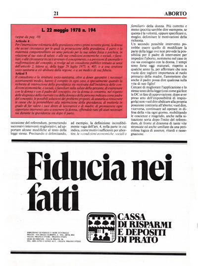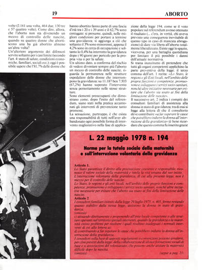 È certamente utile, a qualche anno di distanza, cercare di leggere i dati riguardanti l'applicazione della legge 194/78 sulla «tutela sociale della maternità e sull'interruzione volontaria della gravidanza», ripensando al dibattito, spesso acceso, che animò il Paese in occasione del referendum sulla stessa legge. Pareva, in quei giorni, che l'Italia fosse spaccata in due: da una parte quanti si ostinavano a dire no all'aborto in nome di valori irrinunciabili, esponendosi alle critiche sprezzanti di quanti, l'altra parte, sostenevano di difendere una conquista sociale, attaccata da chi non voleva capire che si trattava non di introdurre un mezzo per il controllo delle nascite ma di «sconfiggere la piaga dell'aborto clandestino».