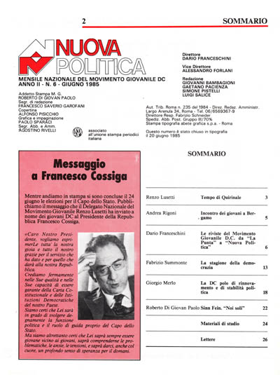 Mentre andiamo in stampa si sono concluse il 24 giugno le elezioni per il Capo dello Stato. Pubblichiamo il messaggio che il Delegato Nazionale del Movimento Giovanile Renzo Lusetti ha inviato a nome dei giovani DC al Presidente della Repubblica Francesco Cossiga.