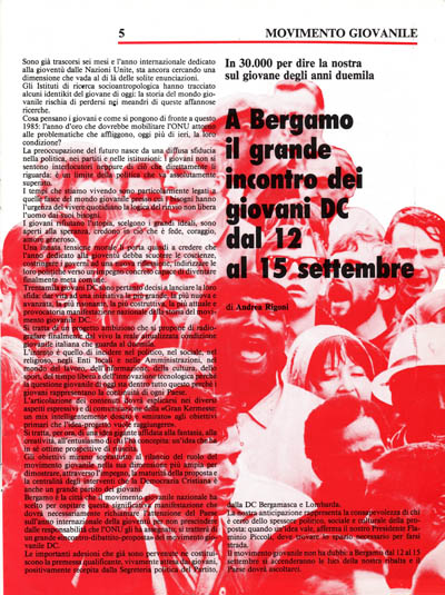 Bergamo è la città che il movimento giovanile nazionale ha scelto per ospitare questa significativa manifestazione che dovrà necessariamente richiamare l'attenzione del Paese sull'anno internazionale della giuventù per non prescindere dalle responsabilità che ò'ONU gli ha assegnato: si tratterà di un grande «incontro-dibattito-proposta» del movimento giovanile DC.