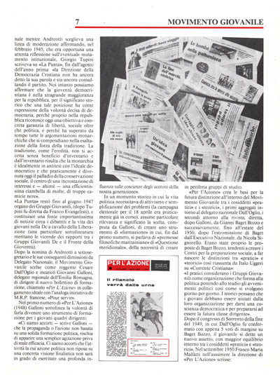 Dopo la nomina di Andreotti a·sottosegretario e le sue conseguenti dimissioni da Delegato Nazionale, il Movimento Giovanile scelse come reggente Cesare Dall'Oglio e incaricò Giovanni Galloni, delegato regionale dell'Emilia Romagna, di dirigere il nuovo bollettino di formazione, chiamato «Per L'Azione» in collegamento ideale con l'analoga iniziativa de M.R.P. francese, «Pour servir».