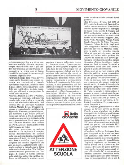 «La prima generazione – scriveva Morlino – va risolvendo il compito storico dell'inserimento dei cattolici nella vita politica italiana, mediante la assunzione di tutti i termini di questa vita. Essasi qualifica come il gruppo dirigente dei cattolici organizzati che con un rigoroso galantomismo individuale conduce la battaglia per la difesa del metodo democratico. Gli si è affiancata una seconda generazione con l'impegno di inserire il mondo cattolico nella dialettica della vita pubblica italiana, modificando le strutture su cui poggiano i termini dello stato storico. (...) In questa opera vi è posto per preparare un terzo gruppo dirigente, che sulla base di una-metodologia e di un linguaggio comune elabori una teoria cristiana della politica che animi un partito-cantiere per la edificazione della disgregazione della realtà italiana di una società comunitaria e per_sonalistica. Sulla base di questa precisa fisionomizzazione, la terza generazione può iniziare un colloquio e fissare di volta in volta la linea di sintesi con le precedenti generazioni.(...) Dopo la generazione – concludeva Morlino – formatasi nell'astensionismo e nell'individualismo del mondo liberale, dopo la generazione formatasi alla macchia della dittatura, questa è la prima generazione che si può sviluppare incardinata nella stessa realtà umana che domani dovrà guidare..».