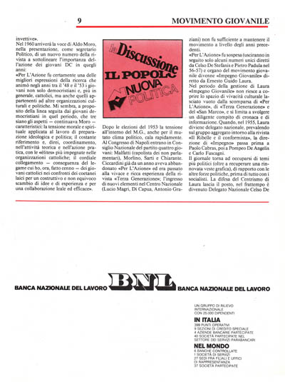 «Per L'Azione fu certamente una delle migliori espressioni della. ricerca che animò negli anni tra il '48 e il '53 i giovani non solo democristiani e, più in generale, cattolici, ma anche quelli appartenenti ad altre organizzazioni culturali e politiche. Mi sembra, a proposito della linea seguita dai giovani democristiani in quel periodo, che tre siano gli aspetti – continuava Moro – caratteristici: la tensione morale e spirituale applicata al lavoro di preparazione ideologica e politica; il costante riferimento e, direi, coordinamento, nell'attività teorica e nell'azione pratica, con le «èlites» più impegnate nelle organizzazioni cattoliche; il cordiale collegamento - conseguenza del legame cui ho, ora, fatto cenno - dei giovani cattolici nei confronti dei coetanei laici per un costruttivo e non equivoco scambio di idee e di esperienza e per una collaborazione leale ed efficace».