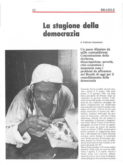 Il Brasile avrebbe avuto bisogno di un mito come Neves nel momento del ritorno alla democrazia, anche perché egli rappresentava il punto d'incontro di interessi contrastanti. Non così il suo successore Sarney, l'ex vicepresidente, per lungo tempo uomo del PDS (il partito più legato ai militari), prima di consentire, con il passaggio del suo gruppo da uno schieramento all'altro, l'elezione di Neves. Sarney resta però un estraneo nella coalizione del PMDB, che raggruppa i partiti di massa e le tradizionali forze di opposizione, e che già avrebbe avuto dei problemi con Neves ad essere maggioranza reale sul piano politico. La difficoltà principale è quella di far riprendere alla gente la fiducia nel confronto democratico, al di là degli entusiasmi passeggeri. Le coraggiose battaglie dei lavoratori, della Chiesa, dell'associazionismo cattolico, hanno costituito un'importante testimonianza durante i venti anni di dittatura.