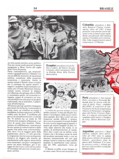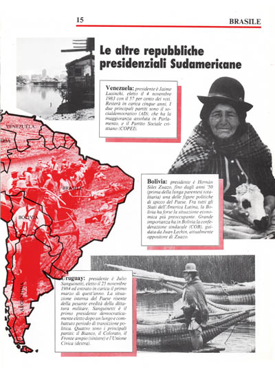 Uruguay: presidente è Julio Sanguinetti, eletto il 25 novembre 1984 ed entrato in carica il primo marzo di quest'anno. La situazione interna del Paese risente della pesante eredità della dittatura militare. Sanguinetti è il primo presidente democraticamente eletto dopo un lungo e combattuto periodo di transizione politica. Quattro sono i principali partiti: il Bianco, il Colorato, il Fronte ampio (sinistre) e l'Unione Civica (destra).