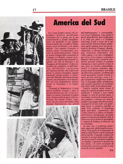 Fra i tanti luoghi comuni che circondano l'America meridionale, continente che si presta per le sue caratteristiche a grandi semplificazioni, sta perdendo le sue ragioni d'essere quello che vorrebbe il Sudamerica terra di dittature e di regimi militari. Uno sguardo d'insieme ci mostra invece un'importante processo di democratizzazione. Grazie ai recenti sviluppi della situazione in Uruguay e in Brasile, restano al potere solo due regimi decisamente totalitari: nel Cile di Pinochet e nel Paraguay di Stroessener. Il discorso sarebbe più complesso se dall'America meridionale passassimo all'America centrale, ma va detto che anche in questa travagliata regione emergono segnali positivi, a cominciare dal Salvador del democristiano Duarte, per proseguire con le discutibili ma non insignificanti elezioni tenute in Nicaragua e in Guatemala.