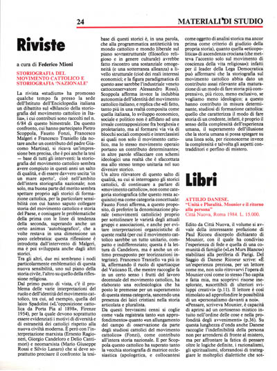 La rivista «studium» ha promosso qualche tempo fa presso la sede dell'Istituto dell'Enciclopedia italiana un dibattito sul «Bilancio della storiografia del movimento cattolico in Italia», i cui contributi sono raccolti nel n. 6/84 di questo bimestrale. Da questo confronto, cui hanno partecipato Pietro Scoppola, Fausto Fonzi, Francesco Malgeri e Francesco Traniello (da notare anche un contributo del padre Giacomo Martina), si ricava un'impressione ben precisa, che è poi anche la tesi-base di tutti gli interventi: la storiografia del movimento cattolico sembra avere compiuto in questi anni un salto di qualità, e di essere davvero uscita 'in un mare aperto', cioè nell'ambito dell'intera storiografia nazionale; non solo, ma buona parte del merito sembra spettare proprio agli storici di formazione cattolica, per la particolare sensibilità con cui hanno saputo collegare storia del movimento cattolico e storia del Paese, e coniugare le problematiche della prima con le linee di tendenza della seconda, superando anche un certo animus 'autobiografico', che a volte restava in una dimensione un poco celebrativa: questa riflessione è introdotta dall'intervento di Malgeri, ma è poi sviluppata anche dagli altri storici.