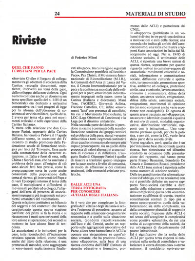 Nella seconda parte del dossier si prendono in esame i contenuti della sensibilizzazione condotta dai gruppi cattolici sul problema de!Ja pace,sia sul versante della critica a tuttii segmenti costitutivi di un quadro internazionale sempre più cupo e preoccupante, sia su quello della proposta di valori alternativi a una cultura di violenza e di diffidenza. L'augurio finale di Giuseppe Pasini è quello di riuscire a trasferire questo impegno per la pace anche a livello di comunità, in modo da- affiancare a dei cristiani testimoni, delle comunità cristiane profetiche.