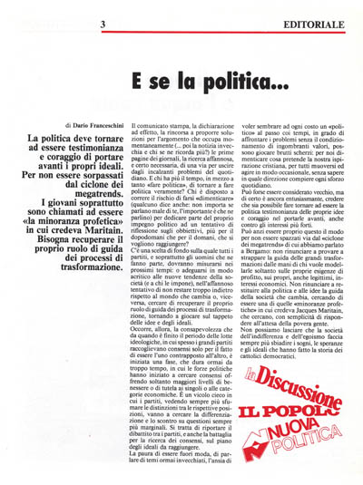 Può anzi essere proprio questo il modo per non essere spazzati via dal «ciclone dei megatrends» di cui abbiamo parlato a Bergamo: non rinunciare a provare a strappare la guida delle grandi trasformazioni dalle mani di chi vuole modellarle soltanto sulle proprie esigenze di profitto, sui propri, anche legittimi, interessi economici. Non rinunciare a restituire alla politica e alle idee la guida della società che cambia, cercando di essere una di quelle «minoranze profetiche» in cui credeva Jacques Maritain, che cercano, con semplicità di rispondere all'attesa della povera gente.