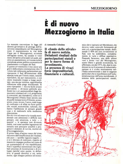 E.questo avvenimento è reso ancor più grave dalla amara constatazione che c'è voluta tale imboscata parlameritare per riproporre il Sud àll'attenzione della stampa tutta per l'intera estate, nonché riprendere, sia pur stancamente, e con «note musicali» troppo a lungo ascoltate, una sia pur minima, approfondita riflessione sulla piaga meridionale. Si sono riproposte – ma era facile arcano prevederlo – divisioni politiche profonde tra i c.d. assistenzialisti (leggi democratici cristiani) ed i c.d. progressisti (i comunisti, per intenderci), come se il Mezzogiorno d'Italia fosse ancora una di quelle lontane terre d'Oriente, sconosciute, e non, invece, l'unico, reale luogo di confronto e di sfida tra forze politiche, sociali, economiche, culturali, che hanno l'ambizione di pensare grandi cose e di realizzarle nella medesima dimensione.