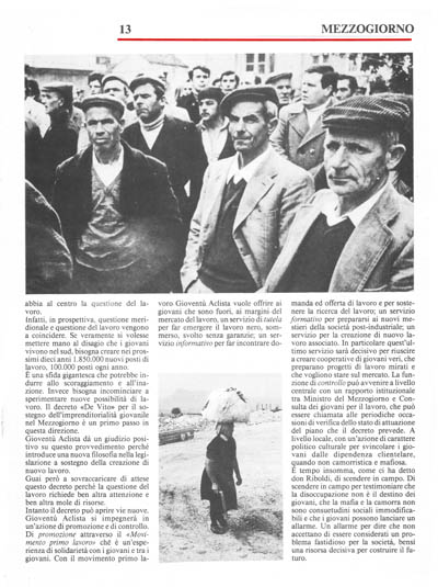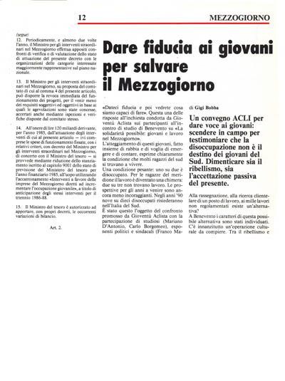 Intanto il decreto può aprire vie nuove. Gioventù Aclista si impegnerà in un'azione di promozione e di controllo. Di promozione attraverso il «Movimento primo lavoro» chè è un'esperienza di solidarietà con i giovani e tra i giovani. Con il movimento primo lavoro Gioventù Aclista vuole offrire ai giovani che sono fuori, ai margini- del mercato del lavoro, unservizio di tutela per far emergere il lavoro nero, sommerso, svolto senza garanzie; un servizio informativo per far incontrare domanda ed offerta di lavoro e per sostenere la ricerca del lavoro; un servizio formativo per prepararsi ai nuovi mestieri della società post-industriale; un servizio per la creazione di nuovo lavoro associato. In particolare quest'ultimo servizio sarà decisivo per riuscire a creare cooperative di giovani veri, che preparano progetti di lavoro mirati e che vogliono stare sul mercato. La funzione di controllo può avvenire a livello centrale con un rapporto istituzionale tra Ministro del Mezzogiorno e Consulta dei giovani per il lavoro, che può essere chiamata alle periodiche occasioni di verifica dellostato di attuazione del piano che il decreto prevede. A livello locale, con un'azione di carattere politico culturale per svincolare i giovani dalle dipendenza clientelare, quando non camorristica e mafiosa.