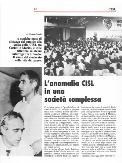 Ci si chiede spesso se l'attuale cultura ed identità della Cisl affondi le proprie radici nella vicenda storica del movimento sociale dei cattolici o se ne rappresenti il superamento qualitativo. Eppure chiunque intende interrogarsi intorno all'anomalia della Cisl, non può non risalire ad atteggiamenti, valori, modi di essere che caratterizzano, con impressionante continuità, tutta una lunga vicenda storica. Nella sua relazione all'ultimo congresso, Carniti, ha voluto ricordare il nome di due maestri, Guido Miglioli e Don Primo Mazzolari.