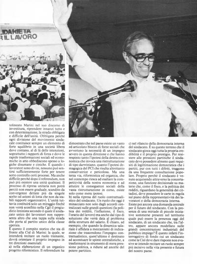 Tocca alla Cisl, oggi, però, come ha sottolineato Marini nel suo discorso di investitura, riprendere innanzi tutto e con determinazione, la strada obbligata e difficile dell'unità. Obbligata perché ogni divisione del movimento sindacale costituisce sempre un elemento di forte squilibrio in una società libera dove contano, al di là delle intenzioni, soprattutto i rapporti di forza e dove le rapide trasformazioni sociali ed economiche in atto obbediscono spesso a logiche disumane e ciniche. E quando i lavoratori sono divisi, nessuno può sentirsi sufficientemente forte per tenere sotto controllo certi processi. Ma anche difficile perché dopo il referendum, non può più esistere una unità qualsiasi. Il processo di ripresa unitaria non potrà perciò non essere graduale, scandito da convergenze dettate più da singole scelte od azioni di lotta che non da stabili rapporti organizzativi. L'unità tuttavia costituirà solo un miraggio finché non verrà sconfitto nella Cgil il pregiudizio leninista secondo il quale il sindacato unico dei lavoratori non rappresenta altro che una tappa sulla strada che porta al partito unico della classe operaia.