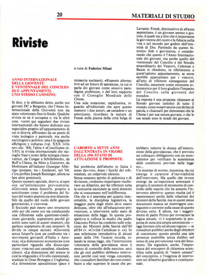 Il fascicolo può essere uno strumento utile per chi come noi sta conducendo una riflessione sulla questione-condizione giovanile, soprattutto perché gli scritti sono tutti di autori stranieri, che parlano soprattutto di casi stranieri. Si divide in cinque sezioni: «Gioventù senza futuro?» (con un confronto tra i movimenti giovanili d'Italia e America),'«La dimensione economica» (con particolare riguardo alla disoccupazione, vista nei casi cana9ese, olandese, cileno), «La dimensione del senso» (e cioè la religiosità e il livello esistenziale, studiata in Gran Bretagna e Ungheria), «La dimensione apocalittica» (pace e minaccia nucleare), «Risposte alternative ad un futuro di speranza», in cui si parla dei giovani come «nuovo paradigma profetico», e del loro rapporto con il Consiglio Mondiale delle Chiese.