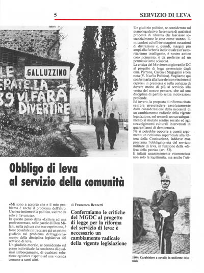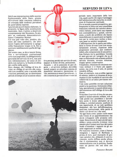 Ecco. dunque, che l'obbligo di leva diviene un obbligo di servizio alla comunità (con modalità varie a seconda delle vocazioni personali) per un determinato periodo di tempo ed un'occasione educativa preziosa perché tale servizio diventi. seppure in forme diverse, permanente. Accanto – ed in posizione di pari dignità – al servizio militare, dovrebbe quindi sorgere un articolato sistema di possibilità alternative (protezione civile, assistenza ai «nuovi poveri» ecc...), che consenta ai giovani di non vivere un periodo tanto importante della loro vita, quale quello che segna il passaggio dell'adolescenza alla maturità, in condizioni di frustrazione spirituale.