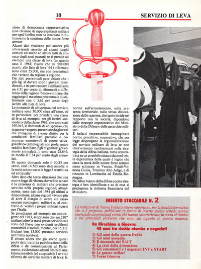 Se si considera che nel frattempo il fenomeno dell'obiezione di coscienza ha raggiunto proporzioni rilevanti (5000 istanze nel 1980, oltre 10.000 nel 1983) appare chiaro che la «dotazione» in uomini delle forze armate italiane è rimasta identica in questo decennio e la nascita di nuove situazioni giuridiche quali il riconoscimento del diritto all'obiezione di coscienza ed al servizio civile alternativo, come anche l'iniezione di democrazia rappresentativa (con elezione di rappresentanti militari per ogni livello), non ha intaccato minimamente la struttura delle nostre forze armate.